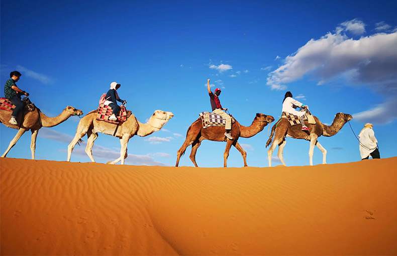 第6天前往梅尔祖卡,这是摩洛哥通往撒哈拉的门户。然后骑着骆驼前往鬼斧神工的撒哈拉沙漠,在星空下入眠。不防计划一下日落时骑骆驼、参加篝火旁的音乐会以及欣赏漫天繁星的夜晚,然后在第二天清晨爬上附近的沙丘欣赏日出。